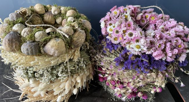 Wir bieten Ihnen immer saisonale Kränze und Trockenblumen aller Art.